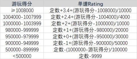 由此可以看出rating的增长,在1000000以上加快,其中1004000到1008000增长最快,4000分足足占了1rating,所以推分最基础的要求就是打到1008000。