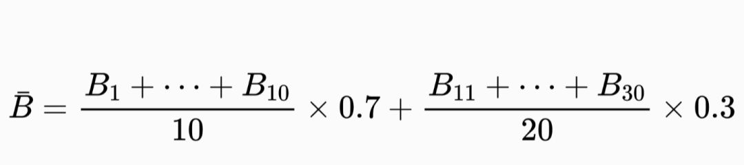 b30中,前10首占比b30的七成,后20首占b30的三成,具体计算方式可以见图3。(bn为b30中排名第n的单曲rating,rn同理)