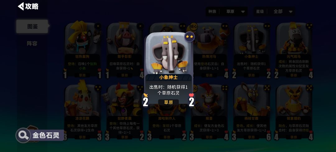 当刷新到小象绅士时,购买使用再卖出,技能效果获得一个草原石灵,再次使用,现在技能就可以使一个石灵+3+3了。
