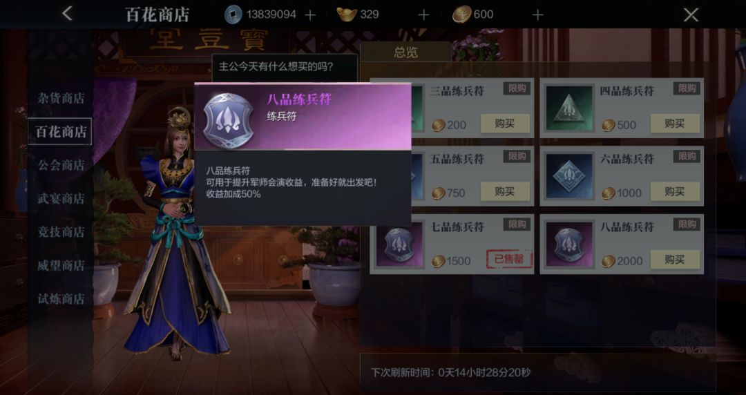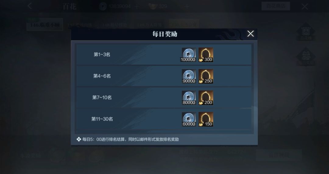 这里说下百花币的用途,百花币可以用来换兵符,兵符可以用来提升军演的奖励。