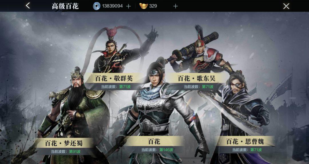 百花分五种其中魏蜀吴群只能用自己国家的武将打,正常百花可以用全武将。