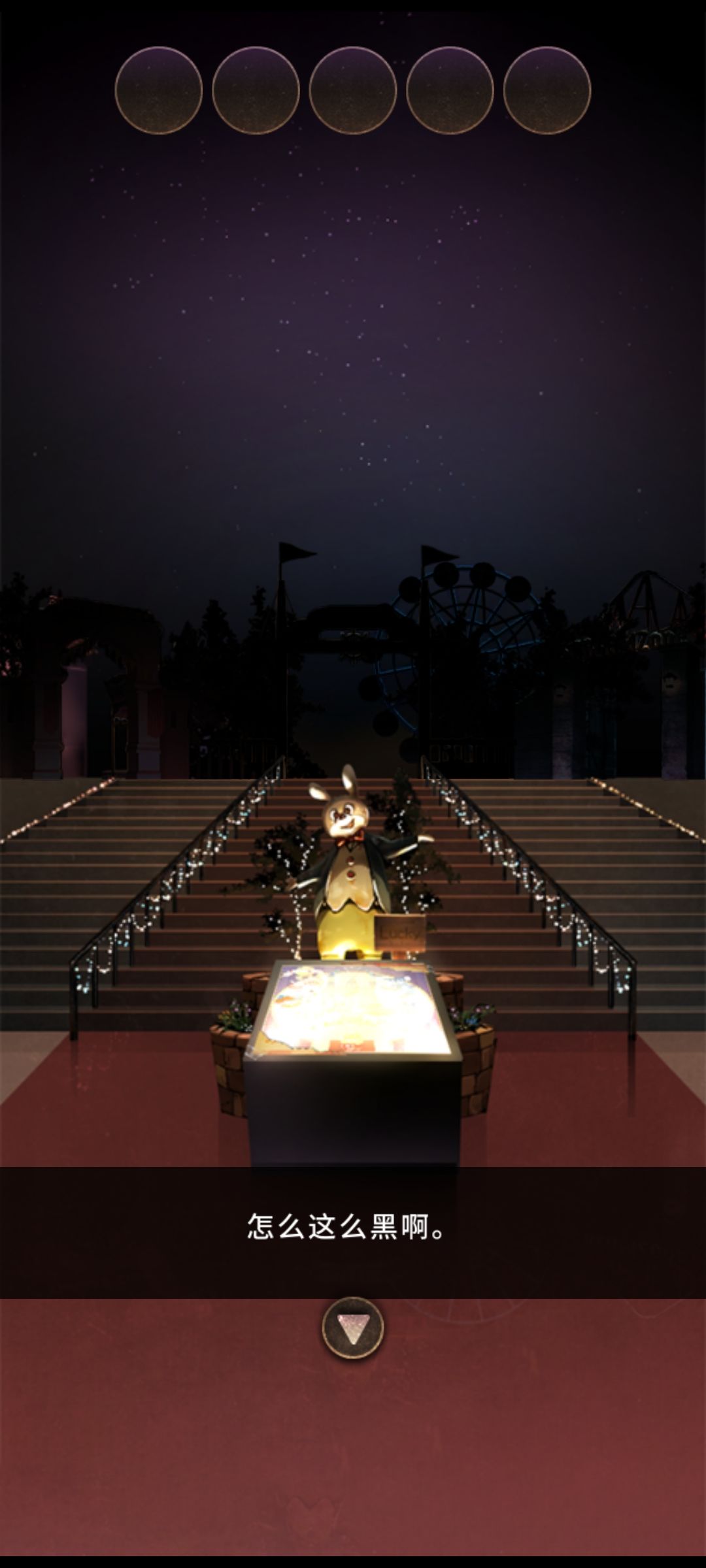 游戏开始我们出现在一个黑漆漆的游乐园门口,似乎是废弃的老式游乐园呢...只有正前方的地图展示台发着光!