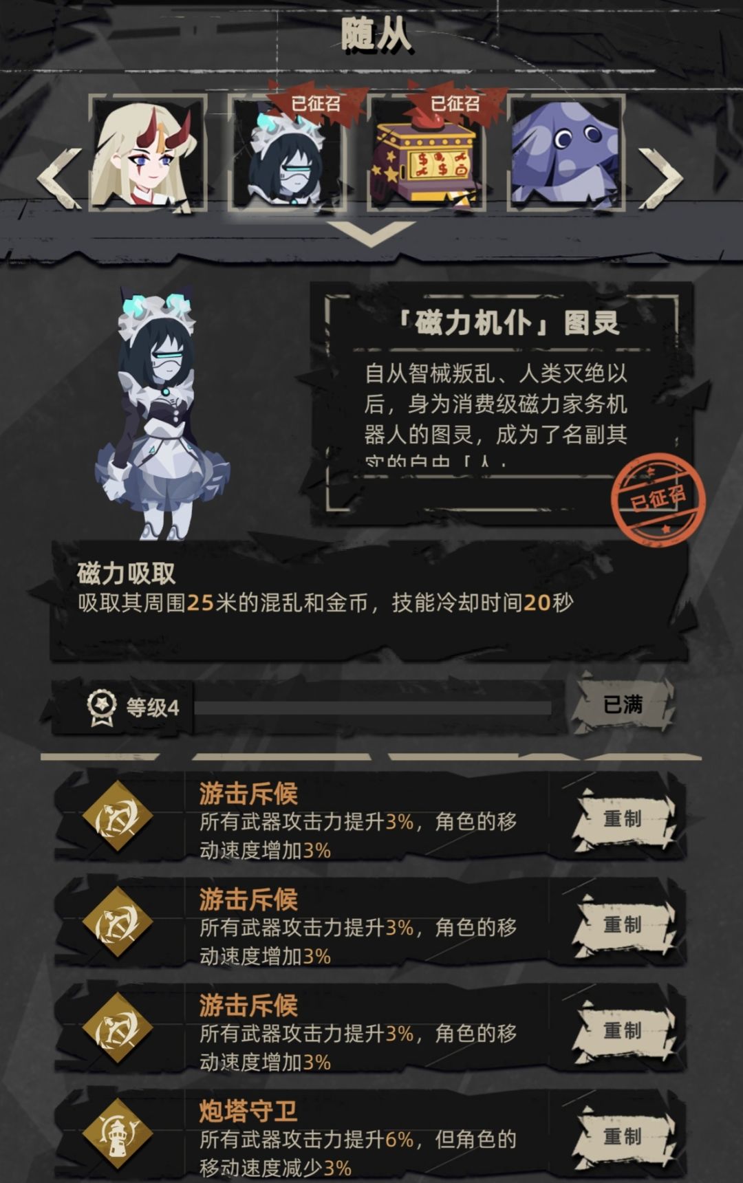 磁力女仆:炮塔+斥候,游戏增伤是累积计算,因此炮塔越多越好,但炮塔的减速在后期体验相当差,所以炮塔和斥候按2:1至1:1来洗,如果想刷竞速可以留四个仆从刷主教,剩下的仆从全部刷炮台和斥候