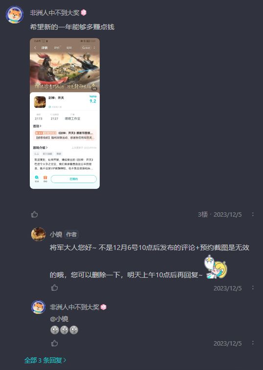 另外再说一嘴你游让玩家预约晒截图还卡时间啊,预约就行了还得分秒不差的预约才能有资格抽奖?让玩家删除回复明天再发回复,怎么不好好设定一下活动规则?还没开测就已经提纯了。