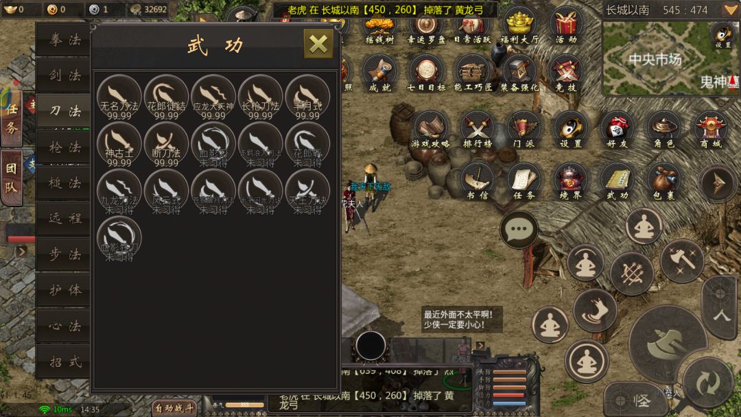 进入游戏后主角还可以选择不同的武器,有些可以从NPC老板娘那里买到,有些只能通过打怪掉落,学习后可以有新的武功,我们在使用武功打怪时可以增加其熟练度,从百分之0到百分之99,进度越高自己伤害就越高,步法,心法等等都是这样。前期建议多买点一级武功,练满后可以很大程度的提升自己的属性,也能提高后续搬砖的效率。