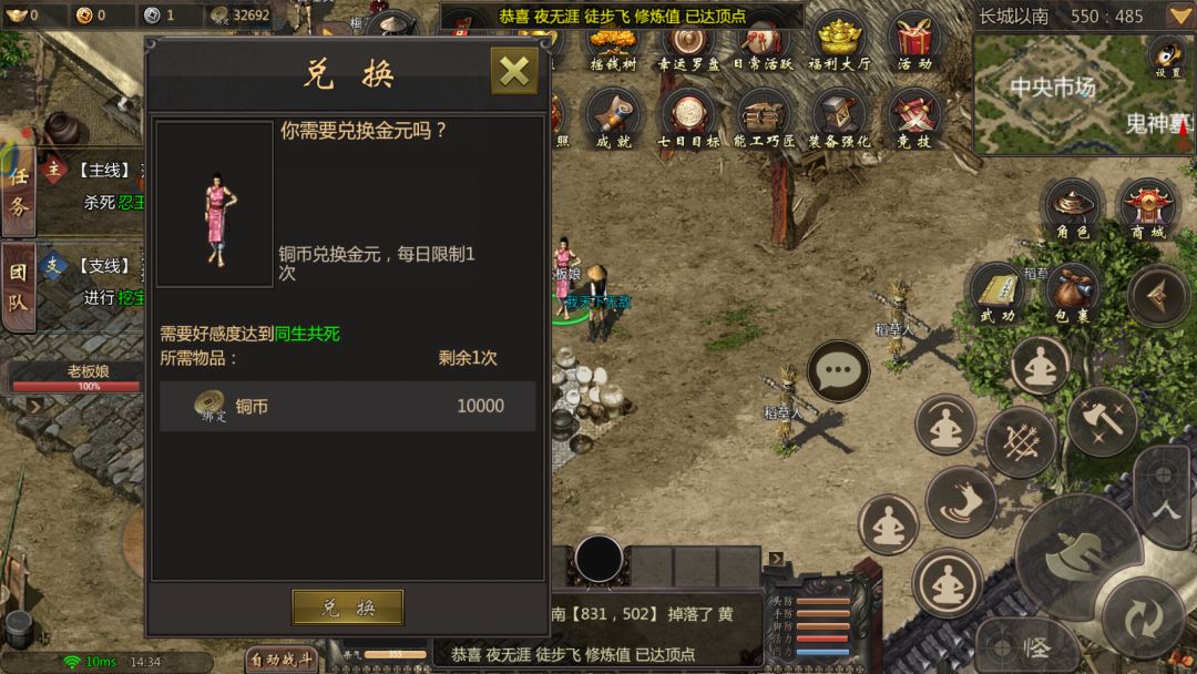 值得一提的是游戏里没有绑定物品一说,除了你直接从商城里面购买的。之后我们把掉落的材料去找老板娘换成钱币。也可以用稀有材料来换取钱币或者其他资源。搬砖玩法就是把钱币换成金元,之后从聊天频道里找老板交易,从而达到变现的目的。