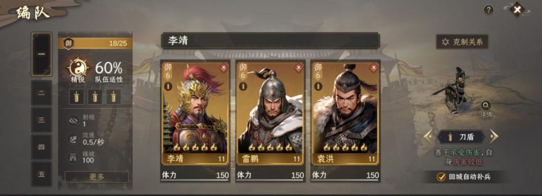 李靖反伤盾阵容主要由李靖、雷鹏、袁洪三人组成,推荐兵种为刀盾。三位英雄都拥有刀盾适性,因此阵容激活后可以获得较为高额的刀盾基础属性加成。