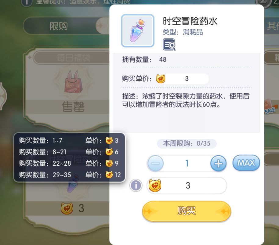 如果是想打虚空,这个药水很不错。每周可以购买7次,这样是最划算的,只需要21猫币,后面再买就没那么划算,对于虚空来说,就是可以打7只mvp怪了,好运可以出1个碎片~