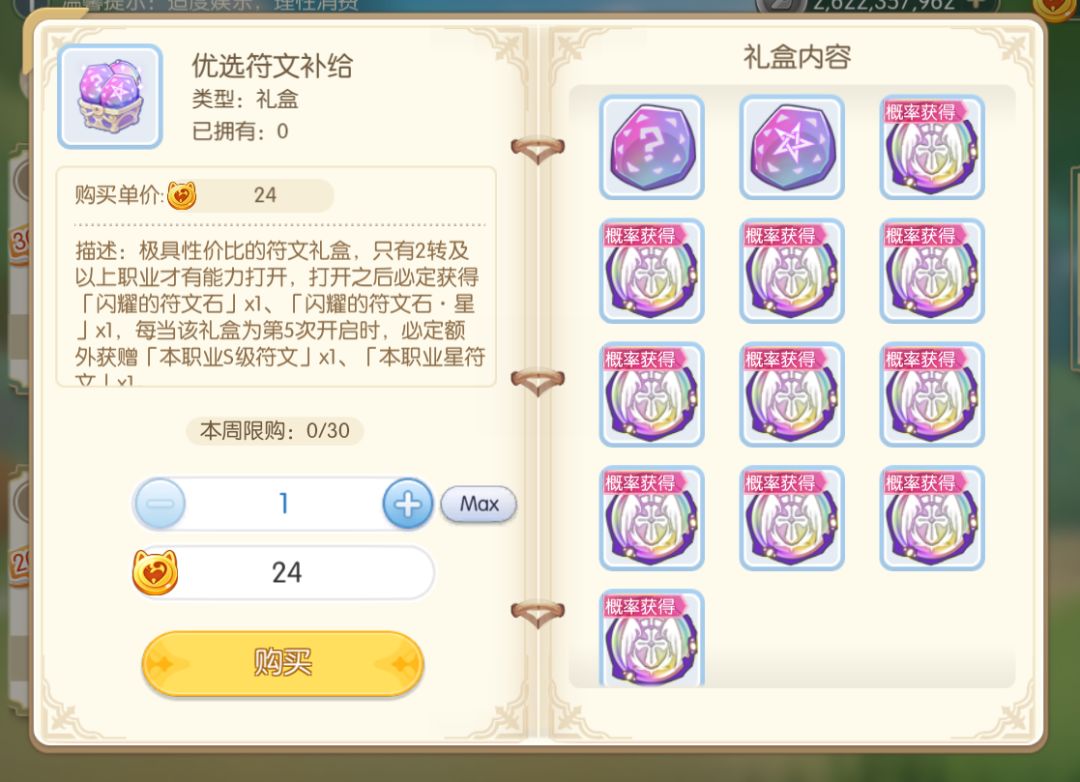 如果对职业想快速毕业,买符文是最好的选择,每周上限30个,第五次开礼盒可以额外获赠本职业s和星符文一枚。