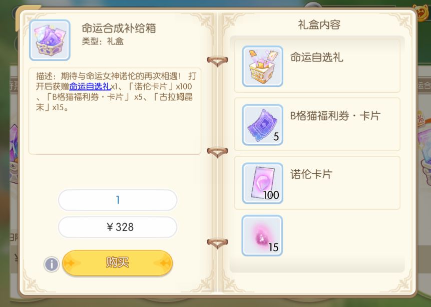 每天可以免费获得100诺伦,一个月就有3100张,可以加快抽卡,而且还有B格猫卡片福利券,意思每3天就可以白嫖一次抽卡片,每一次卡片可以获得50诺伦(只有头三次才有诺伦),运气好可以出到左边的那些卡。意思,一个月可以获得3600诺伦,额外的就是命运自选礼,就是送多30蓝票/红票/黄票