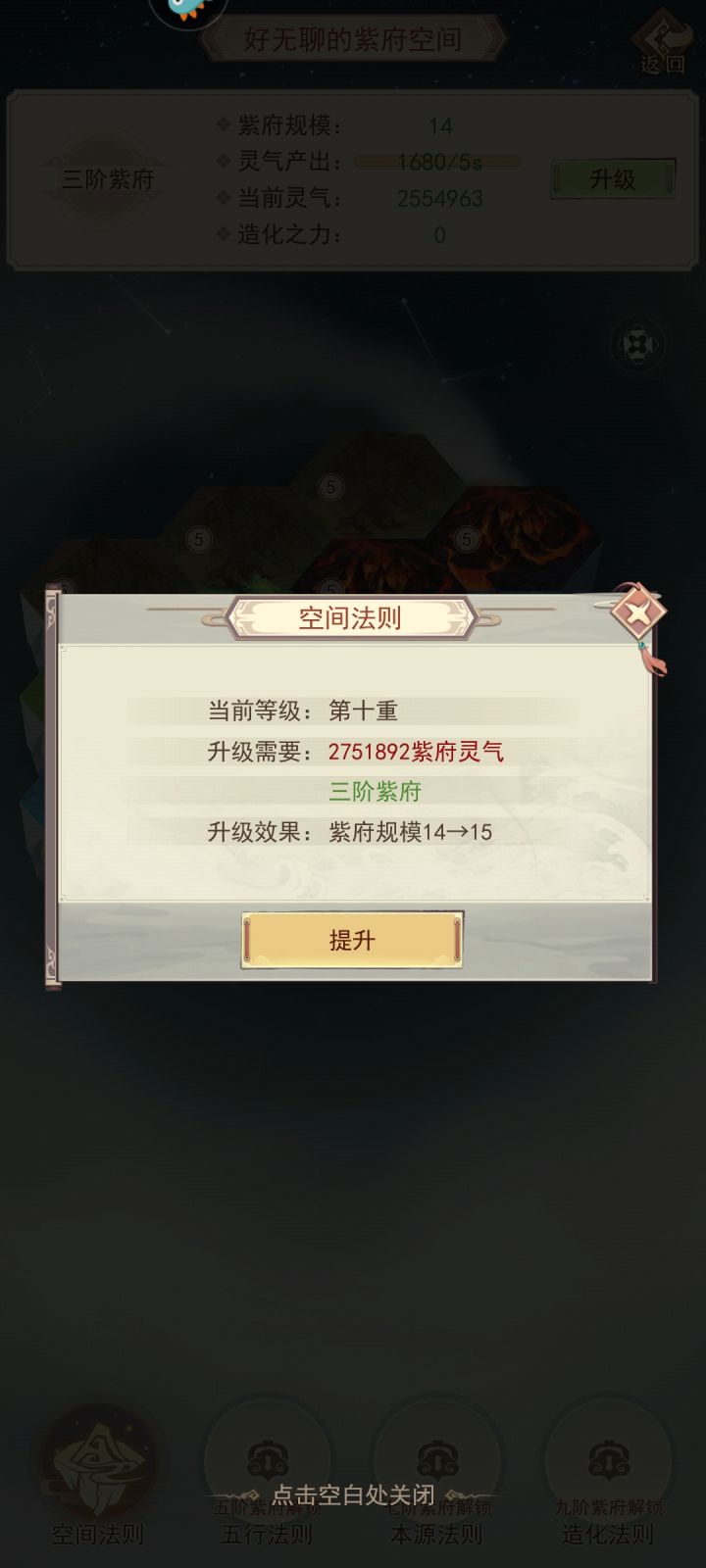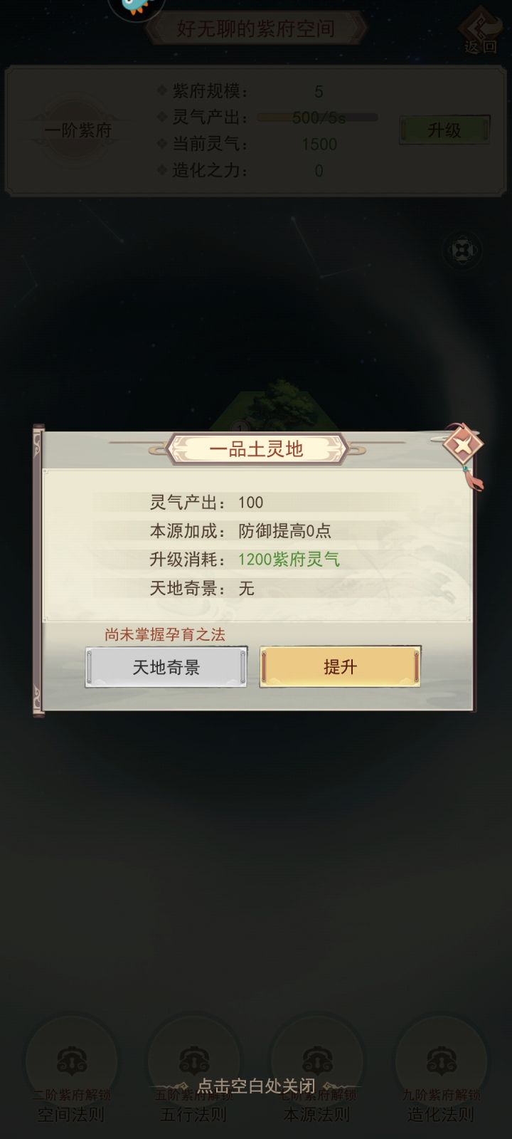 五行法则开放后,可以选择升级五行法则极:每重增加一级对应属性灵地等级上限,每升一级所需灵气大幅增加