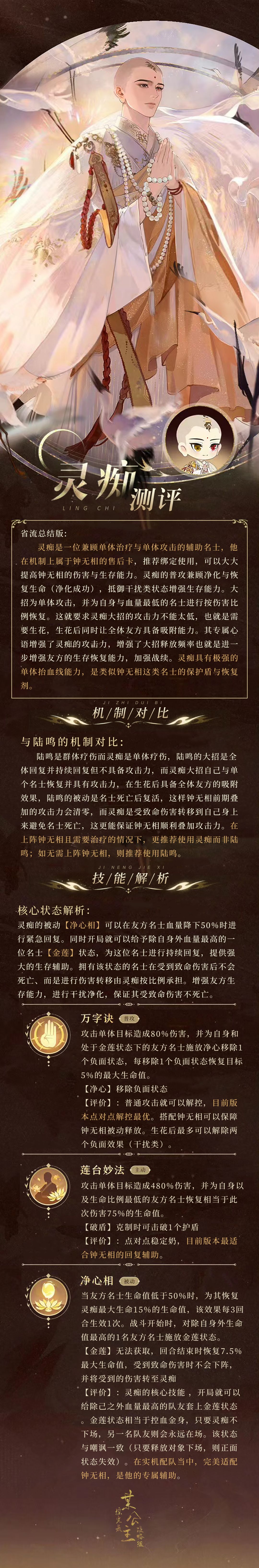 灵痴是一位兼顾单体治疗与单体攻击的辅助名士,他在机制上属于钟无相的售后卡,推荐绑定使用,可以大大提高钟无相的伤害与生存能力。灵痴的被动【净心相】可以在友方名士血量降下50%时进行紧急回复。同时开局就可以给予除自身外血量最高的一位名士【金莲】状态,为这位名士进行持续回复,提供强大的生存辅助。灵痴具有极强的单体抬血线能力,是类似钟无相这类名士的保护盾与恢复剂。