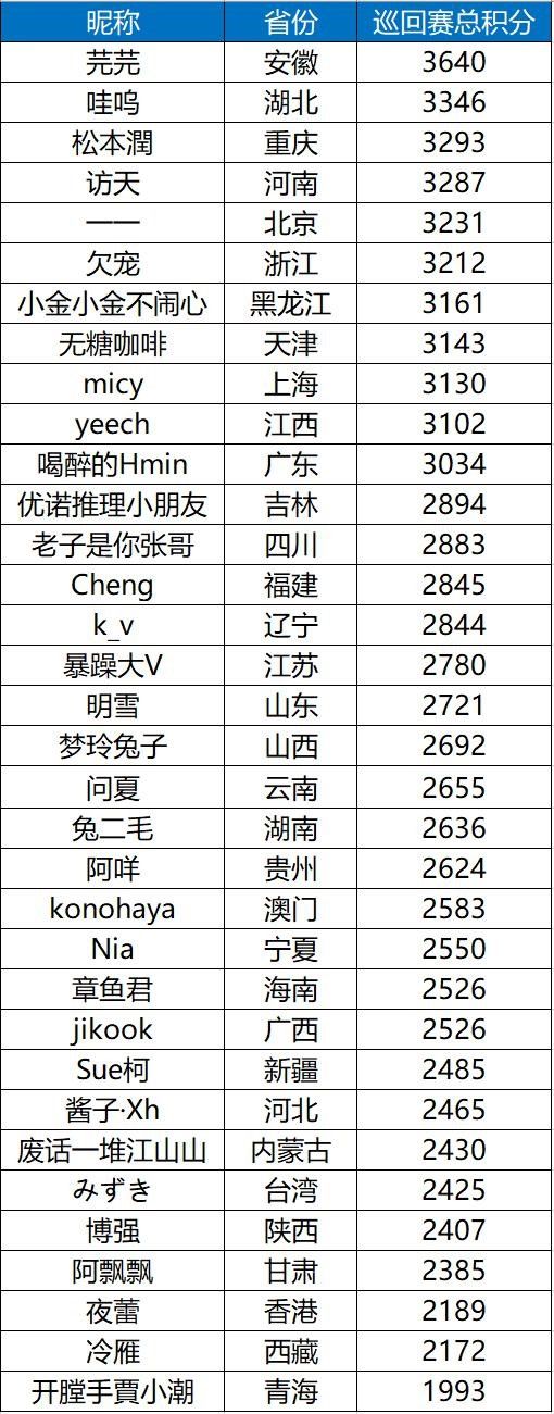延续上次战报中的概况,到目前为止依然没有人能够撼动“芫芫”的榜首地位!值得注意的是,目前ta仍然没有完成巡回赛规定的全部15场比赛,不知道等到修行完毕,功成出山的那一天,在榜单上又会处于什么位置呢?
