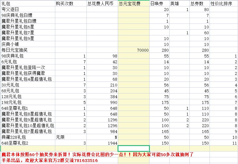 给大家罗列了一下礼包的性价比和魔君所需的花费,还是那句话大佬可以拉到15星,中氪可以到10星拿头像(有属性加成),小V和白嫖玩家建议元宝抽满!(因为比神魔殿划算)