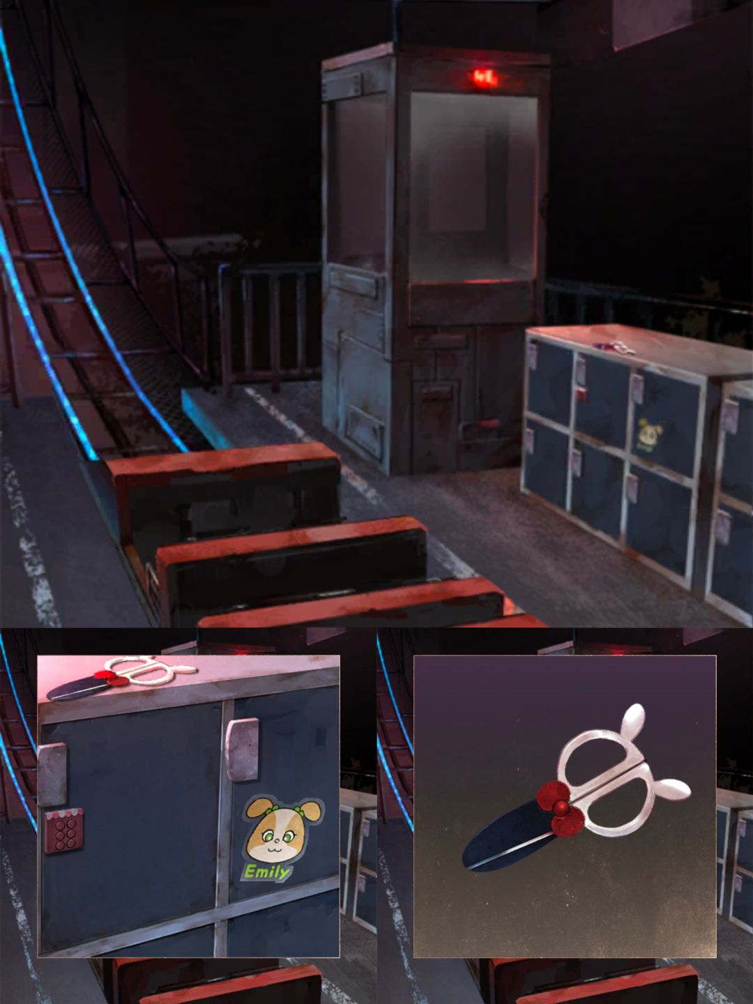 在过山车的储物柜上拿到剪刀,▼来到鬼屋发现椅子上有个包,用剪刀剪断包上的绳子,从包里拿到过山车操作室的钥匙。
