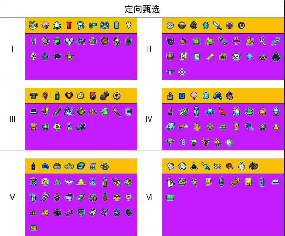 首先定向甄选这个池子会包含往期的up套装以及相关橙色品质和紫色品质的纪念品,蓝色和绿色品质不会包含在内噢,让我们看看目前具体有哪些吧
