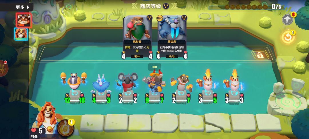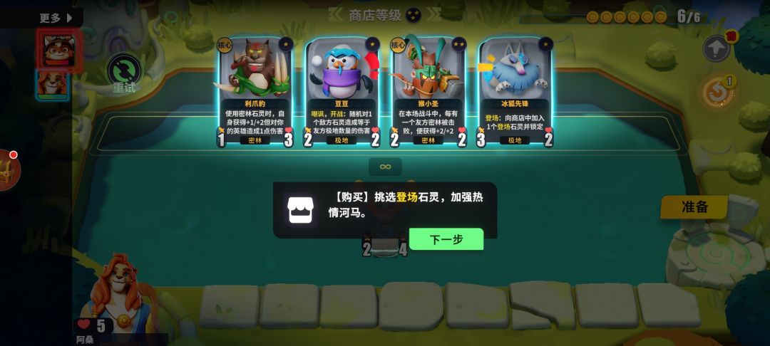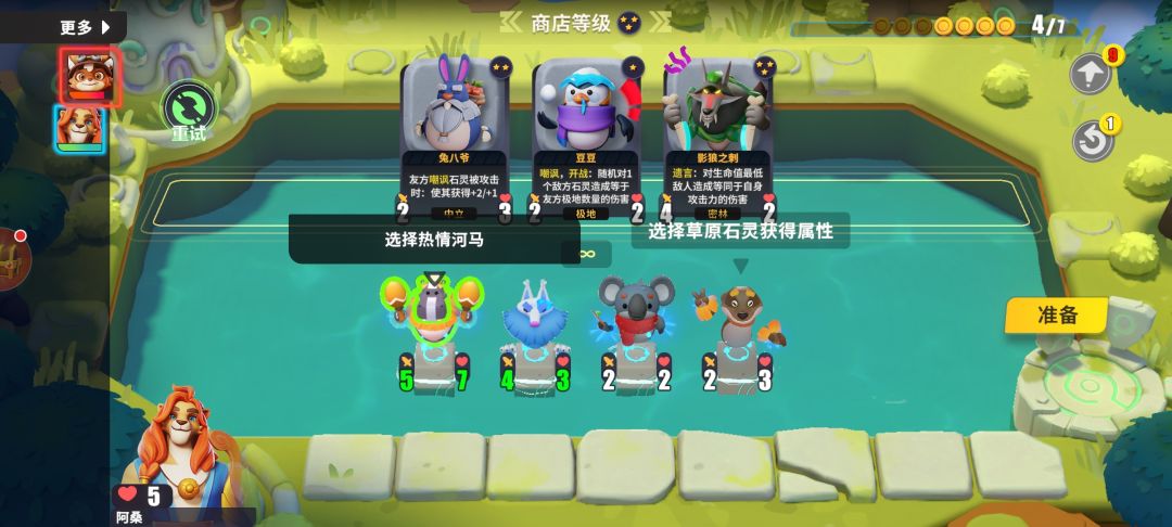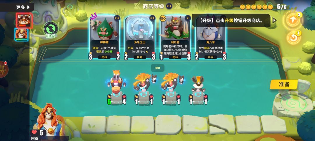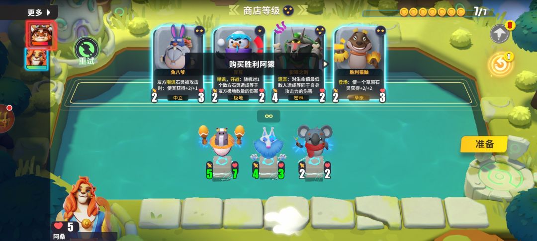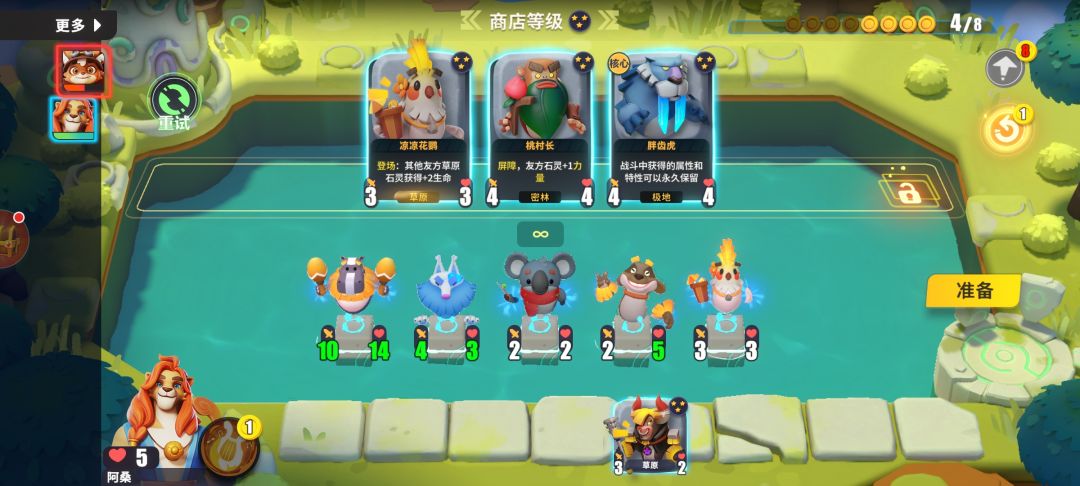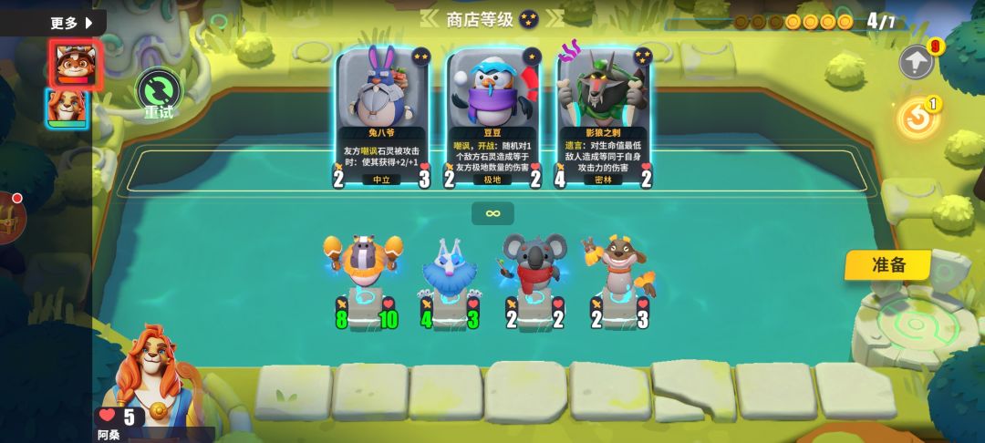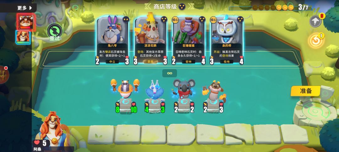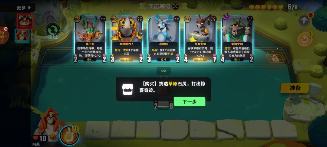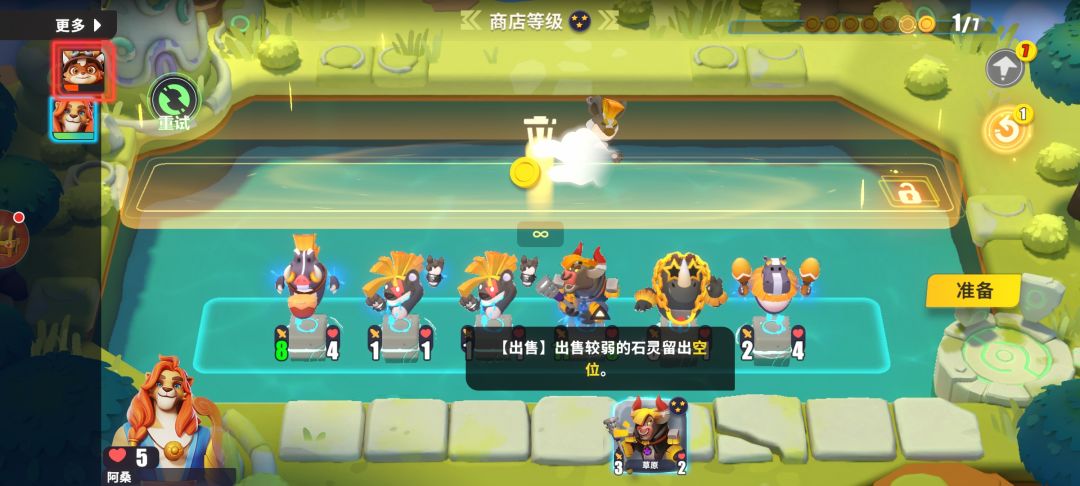 此关卡商店刷新不固定,刷新寻找草原阵营石灵即可轻松过关。战斗区优先出售冰狐先锋,小考拉。