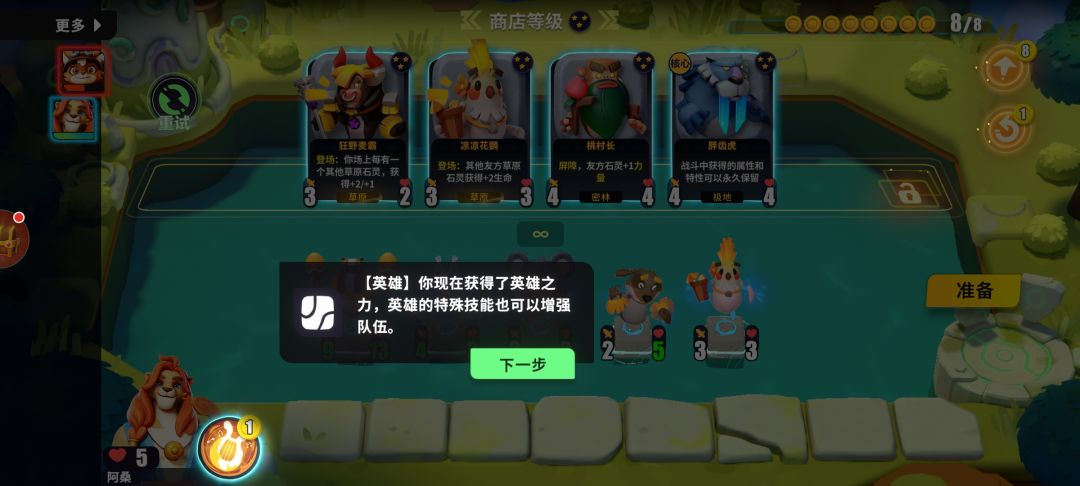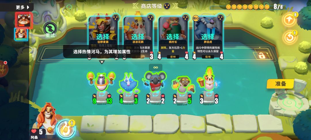 1.购买胜利猫鼬并置入战斗区,技能选择热情河马。