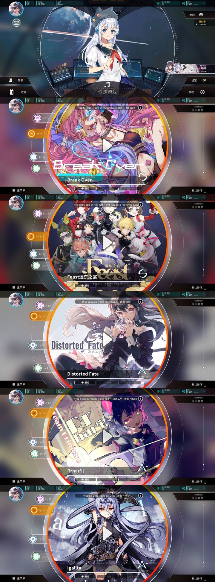 买了曲包后,多一个鸠的驾驶员,直接获得四首解锁歌曲和一首隐藏(需要前四首累计分达到标准,且血条挑战通过可解锁),曲子详情放在后面图里了。东西还是挺丰富的,有条件可以冲。