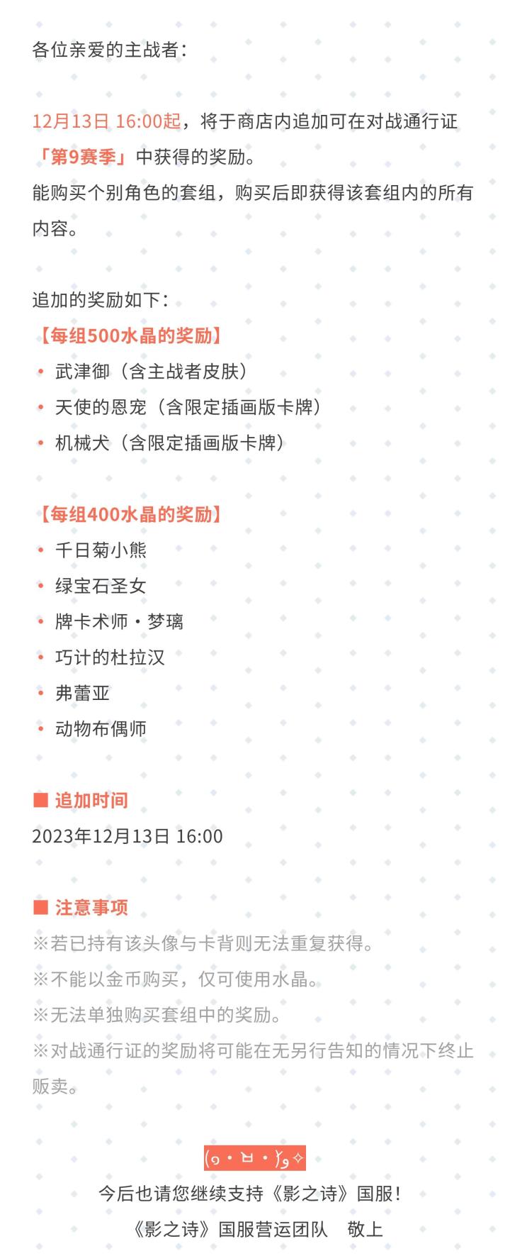 对战通行证「第9赛季」奖励贩卖公告