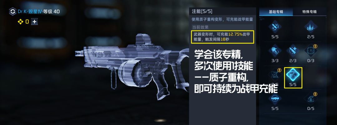 此时,如果你有一把Dr.K毁星(无品质要求),并点出该专精,便可在任何地点为战甲充能,让你们的基地固若金汤!