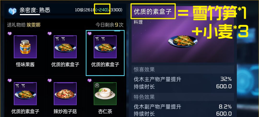 在47级完成雪山主线后,我们会解锁伙伴埃雯娜,与其亲密度达到22级后,便可获得遗珍“埃雯娜的照片”,这里为大家推荐两种最合适的送礼方式:①最效率:使用1个紫色食材+3个蓝色食材,赠送后最高可得240亲密度(如雪竹笋*1+小麦*3);②最经济:使用1个蓝色食材+3个绿色食材,赠送后可得79点亲密度(突出性价比,推荐蓝色鱼*1+绿色鱼*3)