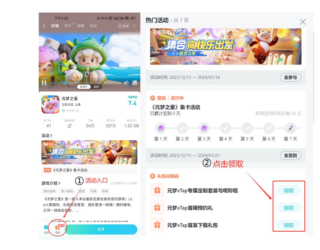 ❸ 安卓客户端左下角点击「活动」领取,iOS客户端点击右上角或查看「活动与公告」进入领取