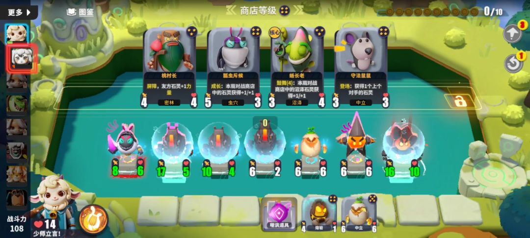 5级商店找【薛定谔的蛋】可以变身为左侧的石灵的镜像,因为是镜像,遇到伤害就会死亡,【章鱼保罗】可以触发【飞刺蜂卫】的遗言效果,让一个金色【飞刺蜂卫】死亡,召唤出来的小蜜蜂数量死亡后就够触发【巨石强犀】的反制4获得护盾复生效果。【熔核蟹】融合【熔岩贝】,给【熔岩贝】加力量伤害。
