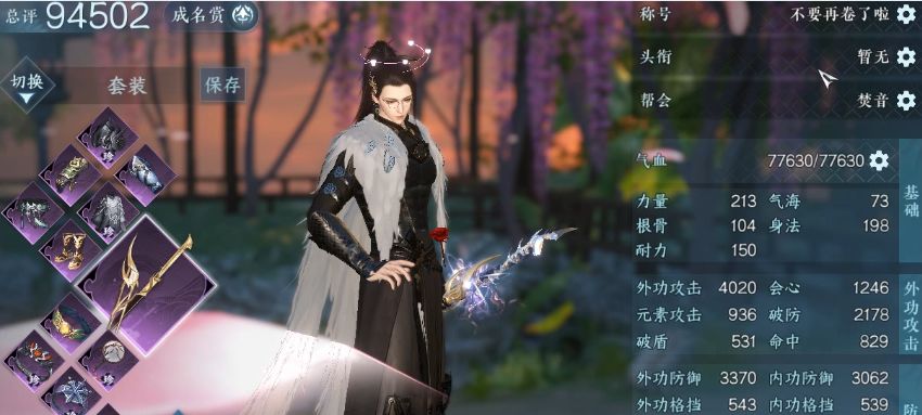 装备与特殊内功携带:柳奎墨白色护腕提供80点破防,灵犀增加会心伤害。