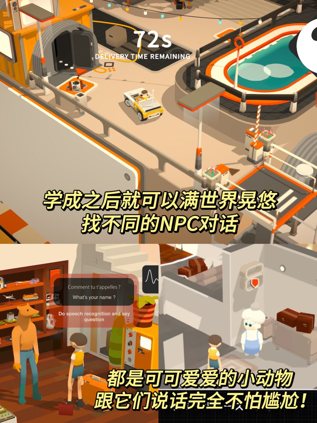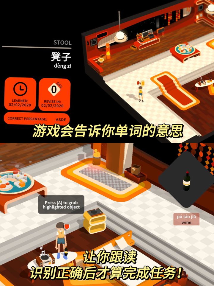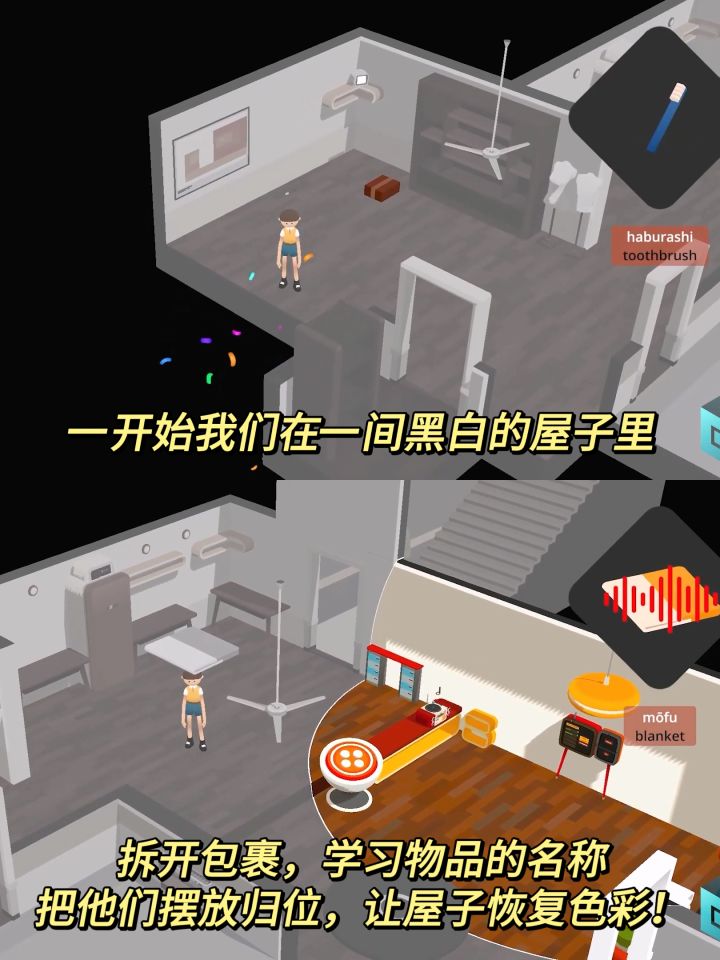 游戏的玩法比较简单,就是拆包裹盲盒,拆出来什么就学什么,游戏会告诉你单词的意思,让你跟读完成后才能拆下一个包裹,全部拆完后房间就能恢复色彩,前往下一个世界啦!