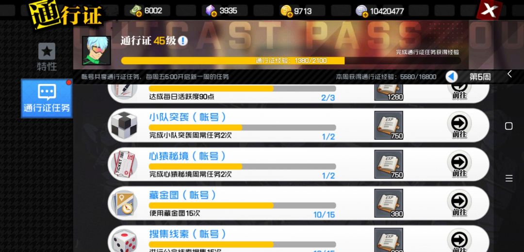 BUG具体描述:我账号下的4个角色完成了4次通行证的任务可是只能领取两次任务结算奖励(图1为通行证,图2.3.4.5分别为我账号下每个角色的日常任务完成情况)