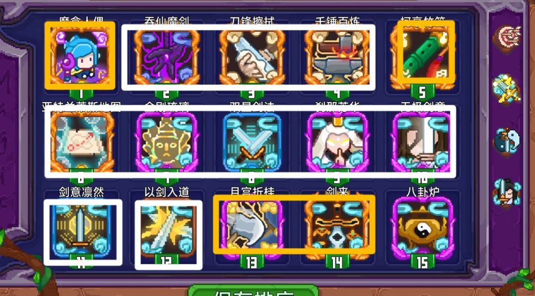 其余卡牌:可选择黑洞,闪光弹这一类强势输出卡,不过都玩剑修了,纯粹的高伤才比较爽。33时也可以选择加入炼丹提高生存和基础属性(组队如果有人帮忙炼丹可以不带)