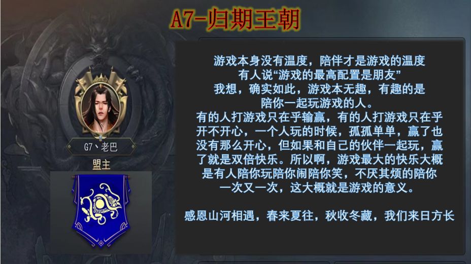 目前为止,我们遇到过6区纵横、1区龍城、11区楚天云月以及正在交战的2区桀骜不驯,不管是盟友还是敌人,游戏里他们都是很好的朋友,在这里代表归期全体,希望他们联盟越来越好,期待再相遇!