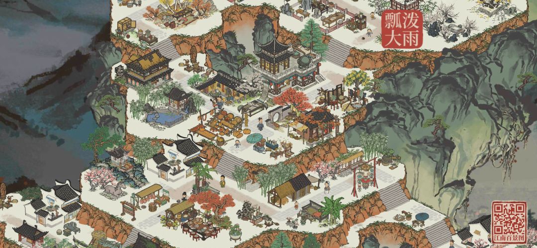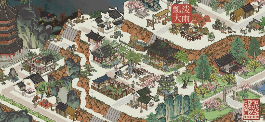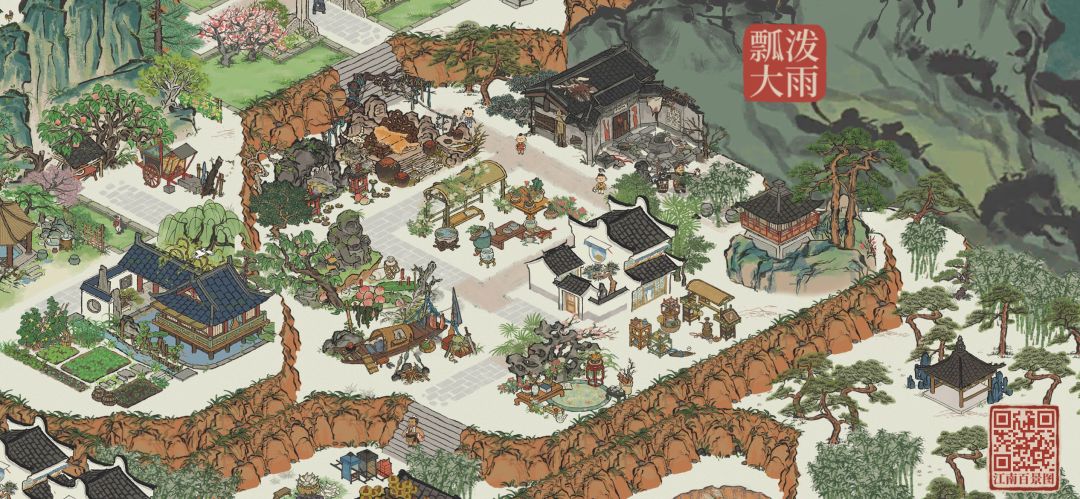 【缭绕峰】:摆放一掌山并搭配大量树林绿色建筑营造一处小山峰景观。