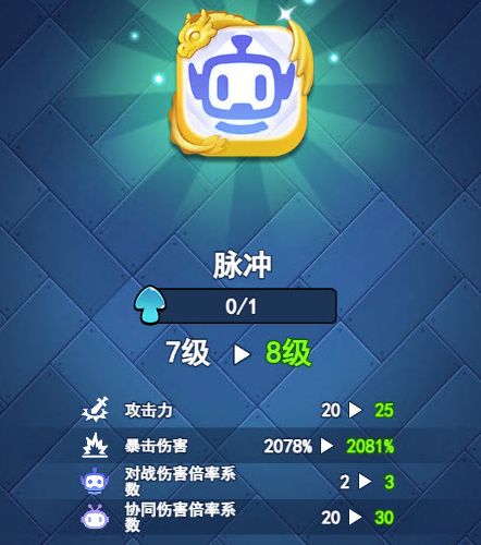 脉冲可以通过提升等级来增加初始攻击,对战、协同的伤害倍率系数,可以看到每升一级协同伤害系数增加非常多,性价比非常高,所以脉冲的伤害计算也十分简单,就是以当前攻击力×层数×倍率伤害,假设我们的攻击力为100,叠加了100层,在竞技对战中就是100×100×5,也就是50000点,合作模式中玩家根据这个计算即可。
