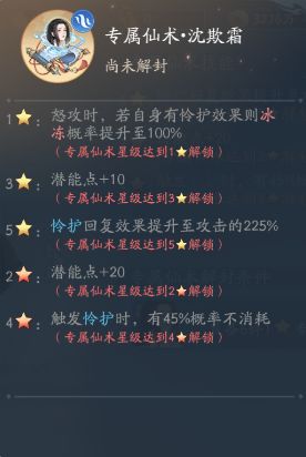 1级:怒攻时,若自身有怜护效果则冰冻概率提升至100%
