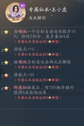 雷小虎的1、3级仙术都相当有看点,仙术1可以增加2回合45%的减伤,本来技能面板就具有45%防爆伤和20%增加防御,叠加45%减伤,可以说是把减伤拉到极致。同时嘲讽目标需要攻击2次后才解除,也让雷小虎的控制效果更强。但是雷小虎还是那个问题,速度面板比较尴尬,一旦被灵儿或者水77控制,就没办法抢到优势,但是pve尤其是神魔之井打boss4铁定是进一步增强。