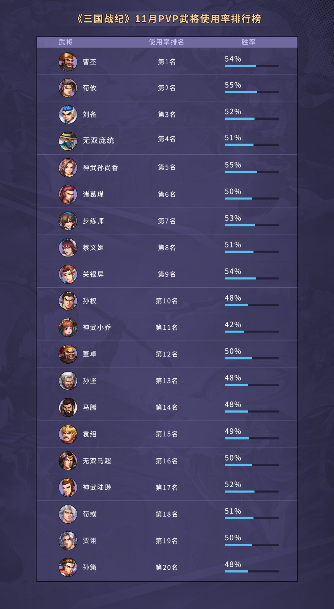 《三国战纪》11月PVP武将使用排行榜