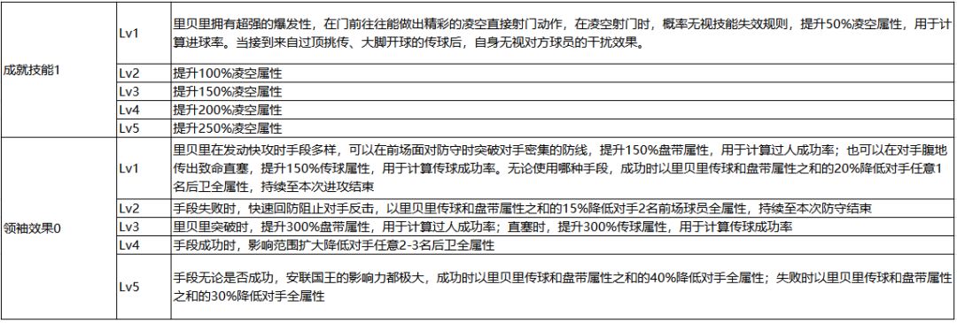 里贝里拥有超强的爆发性,在门前往往能做出精彩的凌空直接射门动作,在凌空射门时,概率无视技能失效规则,提升50%凌空属性,用于计算进球率。当接到来自过顶挑传、大脚开球的传球后,自身无视对方球员的干扰效果。