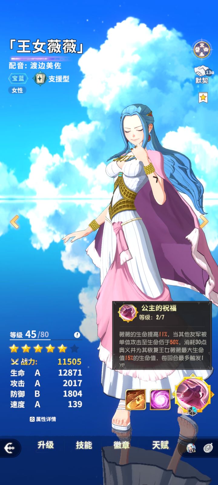 王女vv:铁打的辅助流水的输出,vv就是这样一张卡,特性是前排回合结束额外回奥义;蓝卡受疗效果up光环,还有其他伙伴吃单体技能下半血自动回血,卡片升级(铜卡支援触发额外效果最大收益等于抽四张牌!);单体降攻。总结:当前版本个人主观认为的最强辅助,抽到就血赚,如果普通卡池不变锁首彩卡老沙,那么第二张抽到vv就可以收手开始推关了,其他抽卡资源留到限定池(前提下测情况和卡池没变)。