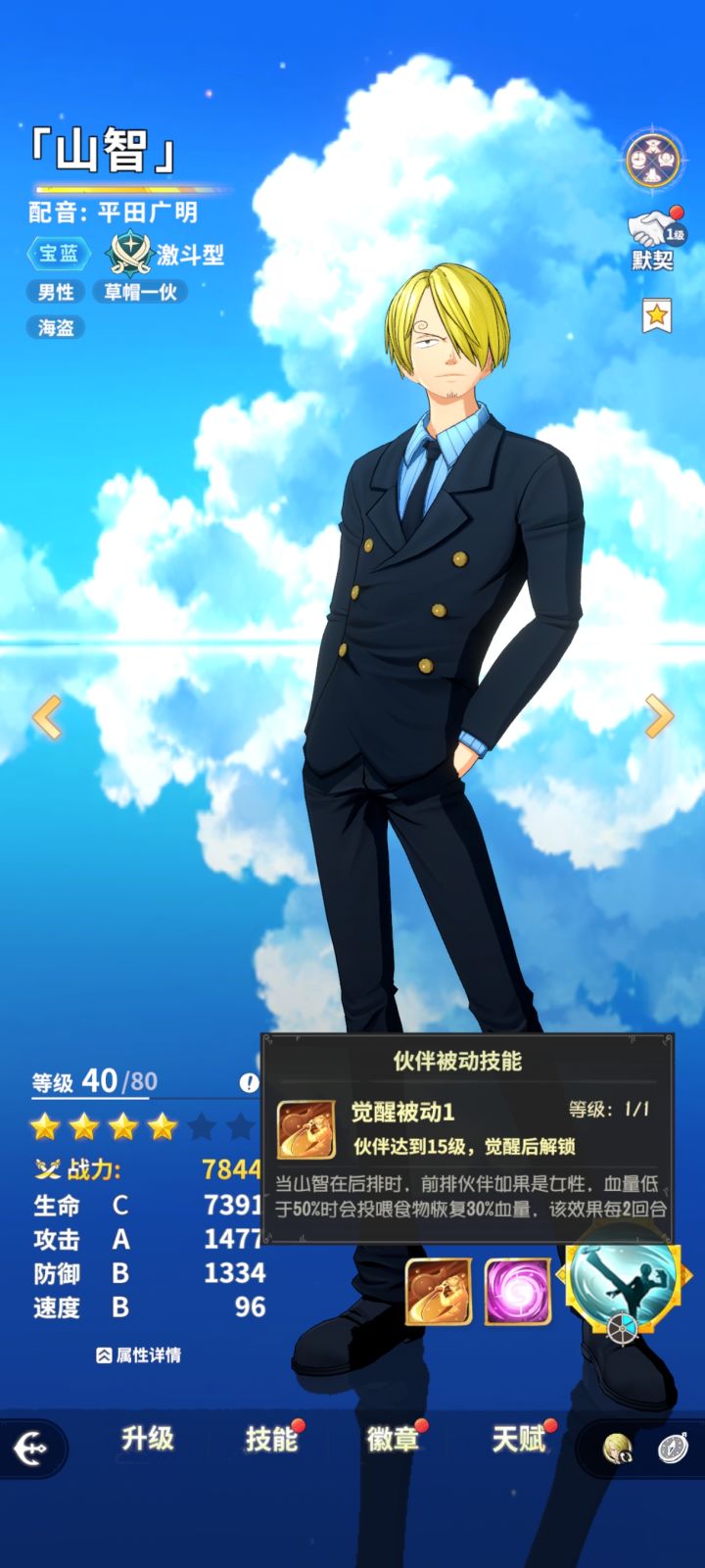 vv额外解析:我个人强推一突或以上山治去当vv后排(vv下半血山治奶vv36%以上血,pvp中vv有奥义点,单点输出就难以从vv去突破,形成保护链条。vv保其他队友,后排山治保护vv不被单体突破;再者也可以配合班吉走班吉嘲讽,vv自动奶班吉这一路线,两者相性极佳,如果班吉后排是罗能形成超强奶盾反伤流。