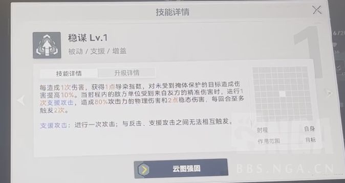 一技能2导染无cd,且自身回复导染能力极强,意味着一技能是个可以无限使用的技能,无cd低消耗的aoe还是比较珍贵的,三格范围也算大的,打两个人即可触发回4导染,配合被动2或4导染回复,基本就是不缺导染。配合大招理想状况下可以一三技能无限交替循环,大招两回合使用一次就会比较舒服了。大招虽然没有指令追加了,但本身就比较强,而且附带两次反击,反击相对于支援攻击的触发条件,反击的成本更低,基本上能稳定触发。