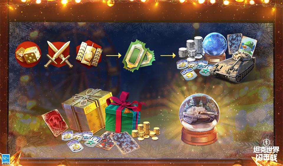 12月11日14时至12月24日14时,驾驶IV至X级坦克参与战斗获得胜利,并根据坦克级别获得不少于指定数量的经验,便可获得集会票券。使用集会票券即可依次解锁奖励链上的一系列好礼,包括各类强化道具、节日涂装、雪人附件等等。在奖励链的终点,则是M系VIII级重坦克莱斯勒K和雪球,前者拥有坚固的正面装甲和炮塔,超乎想象的速度和极快的瞄准,后者则有几率开出全新M系X级坦克歼击车XM66F等VII至X级坦克!