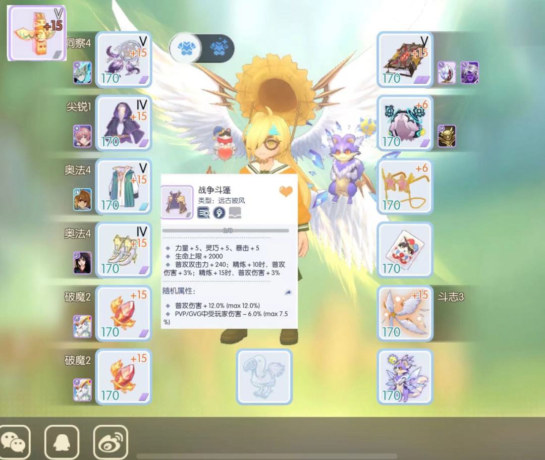 整体配装上,还是法系那几件,当配装和附魔满足了并超过了破防170时,可以考虑将远古披风更换成普攻披风。