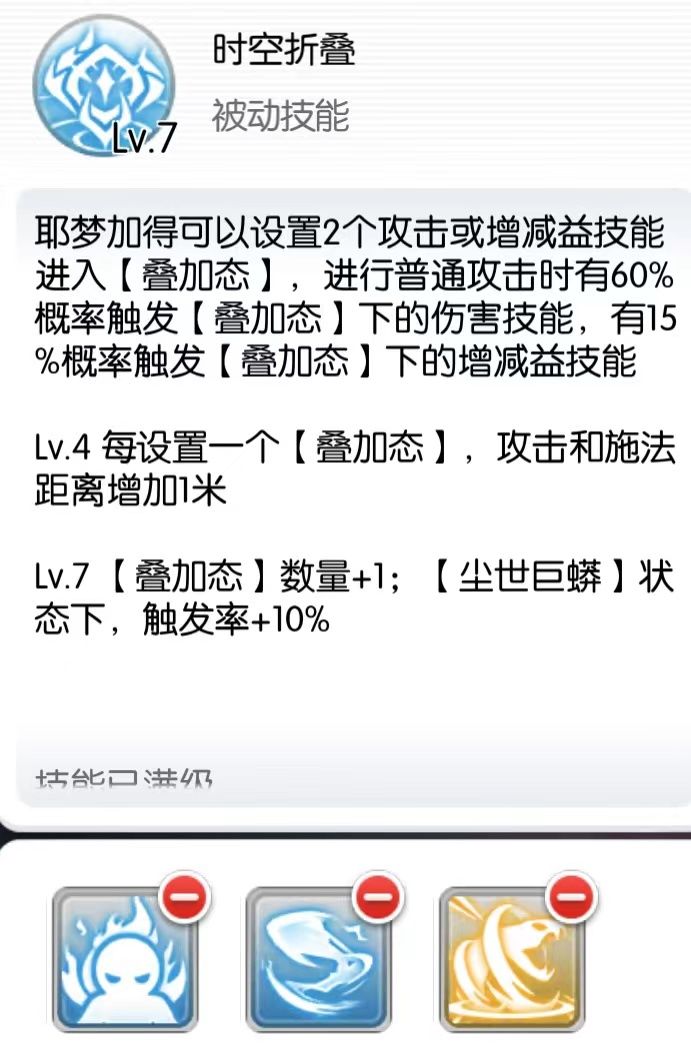 手动技能栏配置如下,建议放入平a,因为手动平a频率明会比自动快且偶尔被怪或技能打到有硬直,虽然自动里有平a,但手动的话整体上输出更顺畅。备战中放的是时空和灾祸。