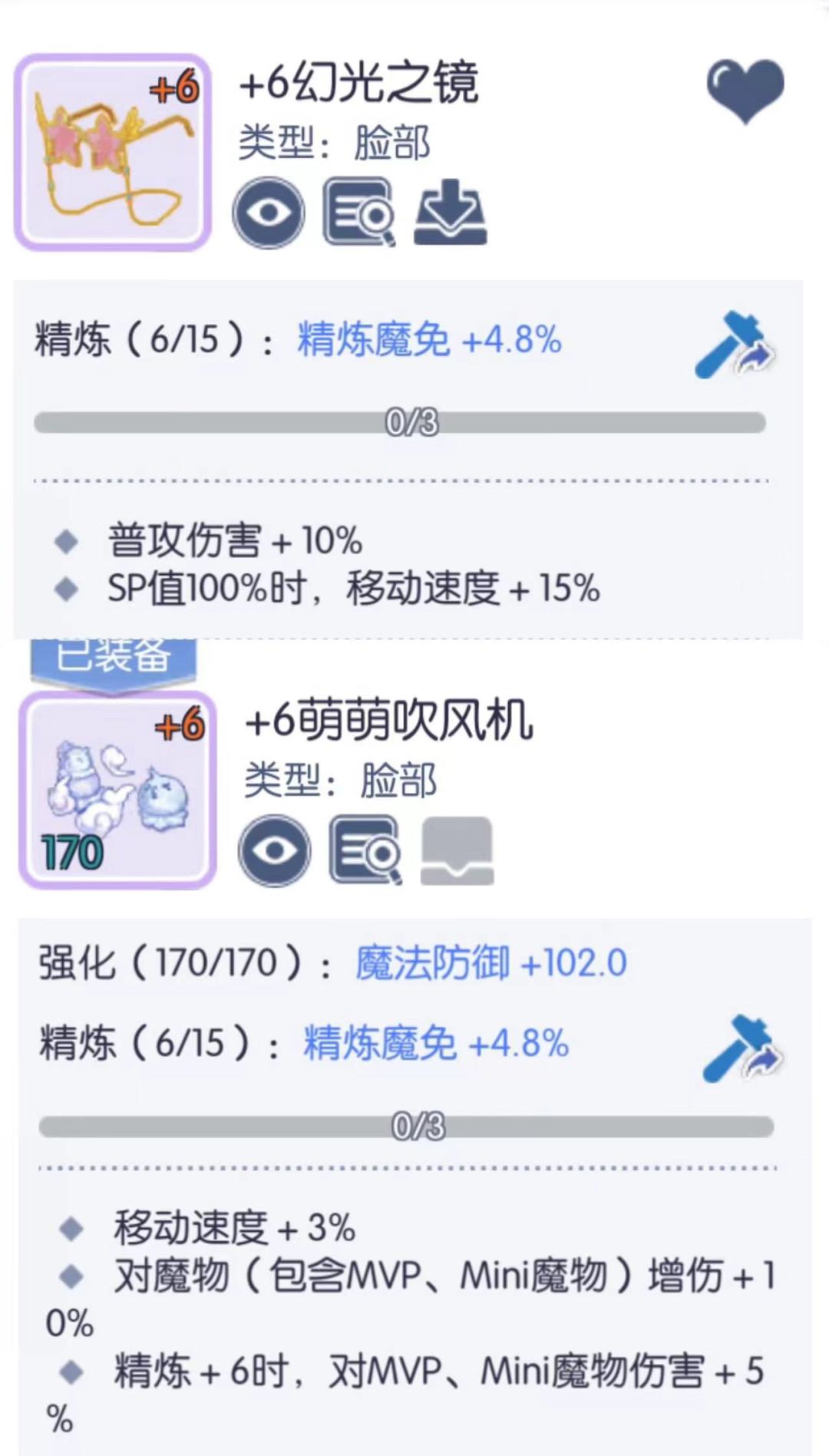 脸部的话,可选的有+10%普攻的幻光之镜和mvp伤的萌萌吹风机,
