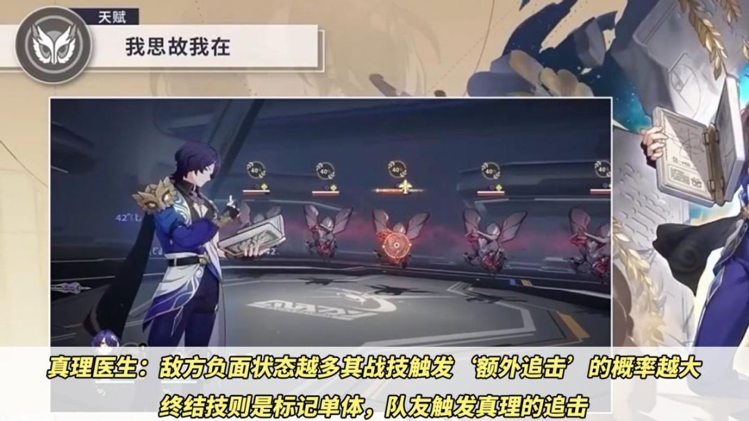 真理医生(5星虚数属性巡猎),敌方负面状态越多其战技触发额外追击的概率越大,并且终结技可标记目标使得队友也可触发真理医生的追加攻击。