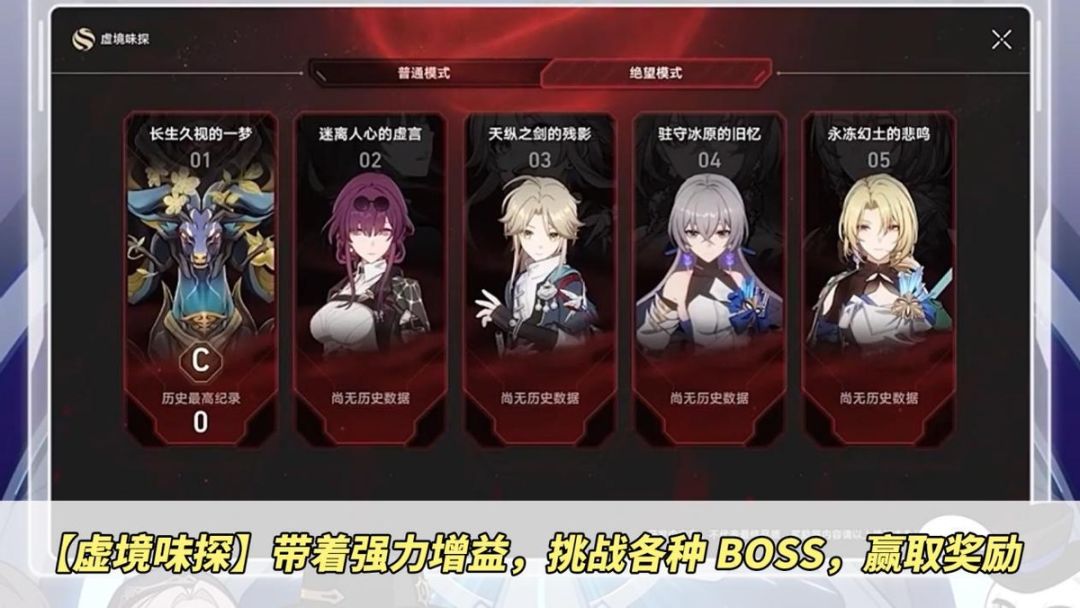 【虚境味探】协助界种科完成测试,需要挑战2种难度多个Boss,期间可以选择一些增益,去战胜强大的敌人。