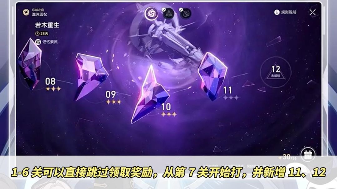 【忘却之庭】混沌回忆根据往期最高层数,可以直接跳过至多1-6层,从第7层开始战斗,并且新增了11、12关,总量单期可获得720星琼,之后会与虚构叙事每6周交替更新一期,此外还优化了一些配队体验与逻辑~
