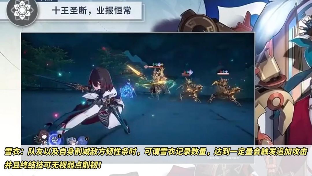 雪衣(4星量子属性毁灭),队友以及自身削减敌方韧性条时,可谓雪衣记录数量,达到一定量会触发追加攻击,并且终结技可无视弱点削韧!是一位介于毁灭与巡猎之间的有趣角色。